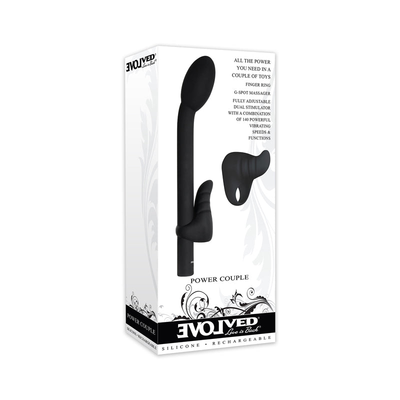 A simultaneous G-Spot and clitoral orgasm is one of the most intensely satisfying experiences for a woman, and this pair of toys can make it happen! The silky-smooth rounded head of the Power G is designed to stimulate the G-spot correctly, with a shaft precisely angled to reach its mark. The pinkie promise provides clit stimulation or erotic massage for him wherever you place it. Material: Silicone/ABS plastic Power G: Total Length: 8.25inches, depth, 1.5 inches , Width: 1.75 Pinkie promise: Height: 2.4 inches , depth, 1.73 inches width 1.31 inches Five Year Warranty .