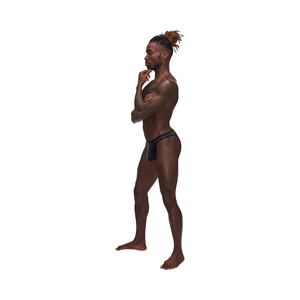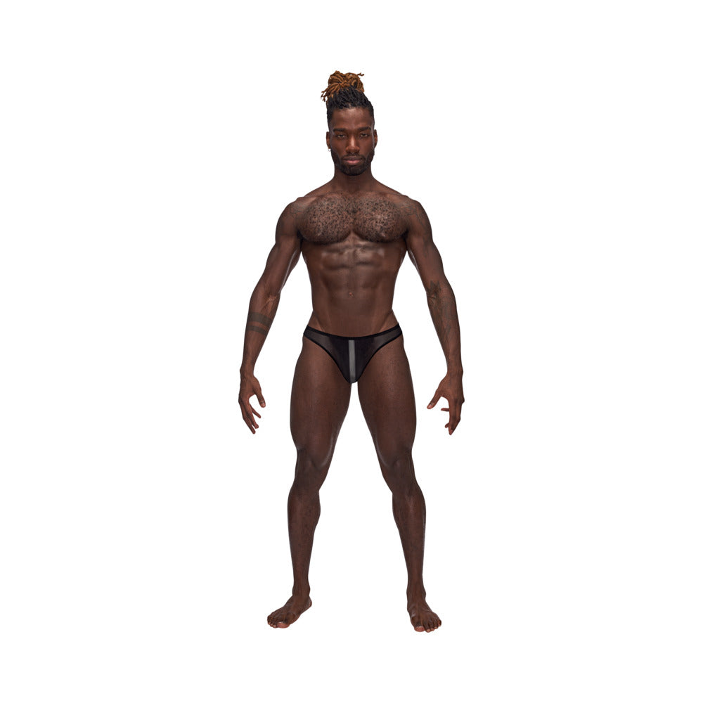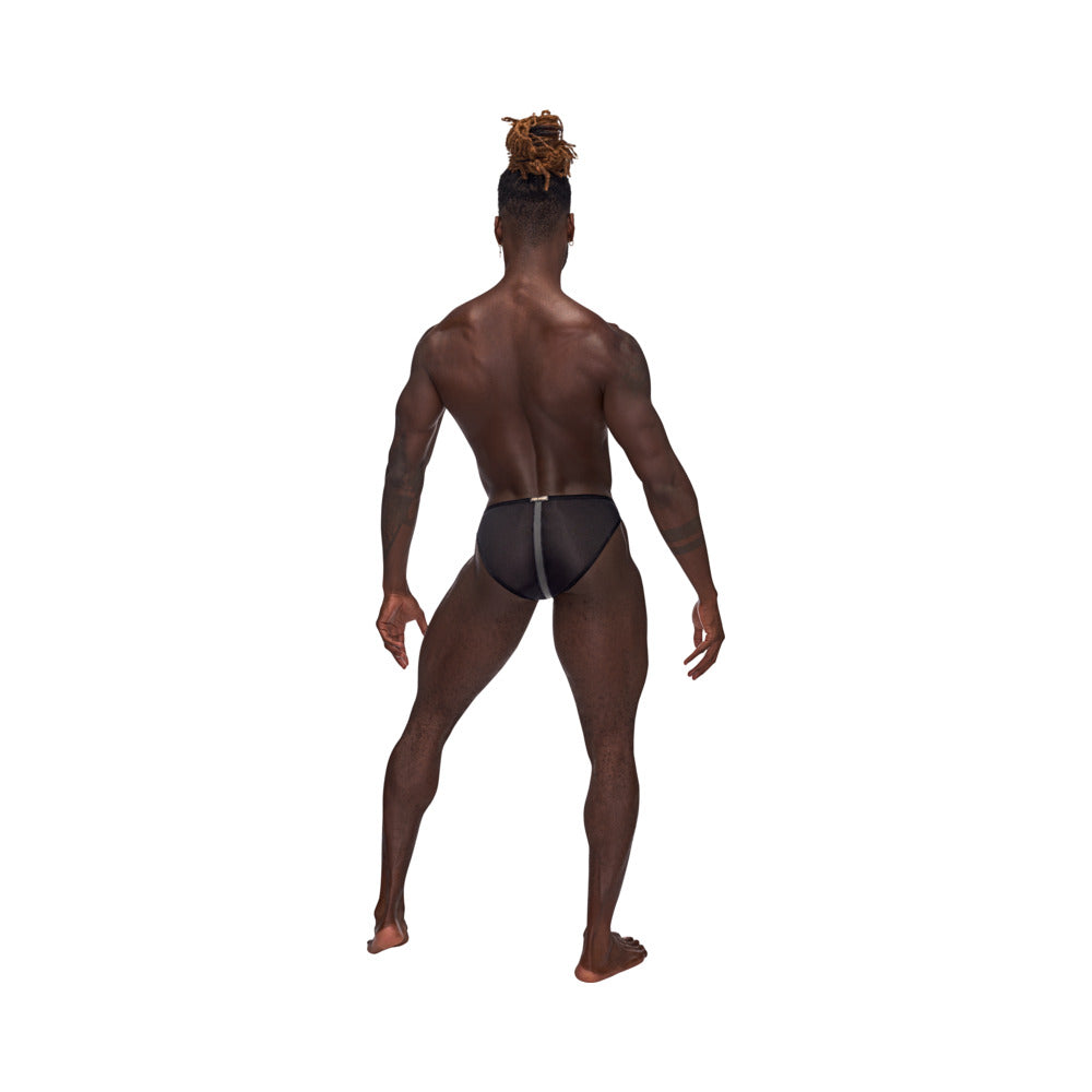 From the Landing Strip collection by Male Power, the Bikini Brief, features thin, plush, elastic trim on waist and legs, tone-on-tone matt onyx insert strip through the pouch and rear and a decorative metallic brand label on rear waistband.
