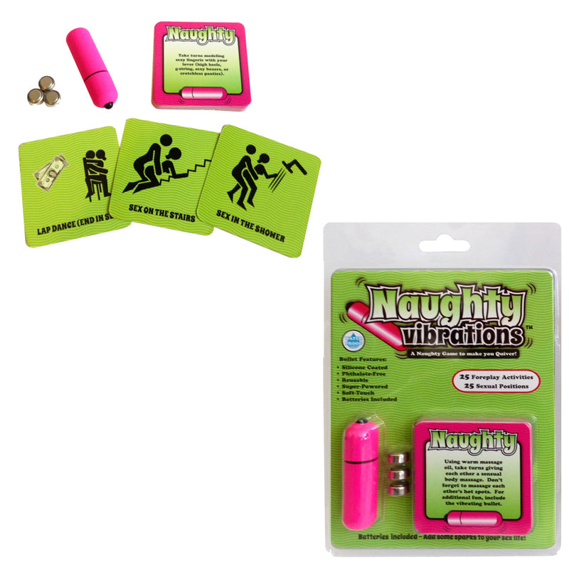 A vibrating bullet plus a deck of cards with 25 foreplay activities and 25 sex positions equals a lot of couplesft. fun. Bullet is silicone coated and the batteries are included.