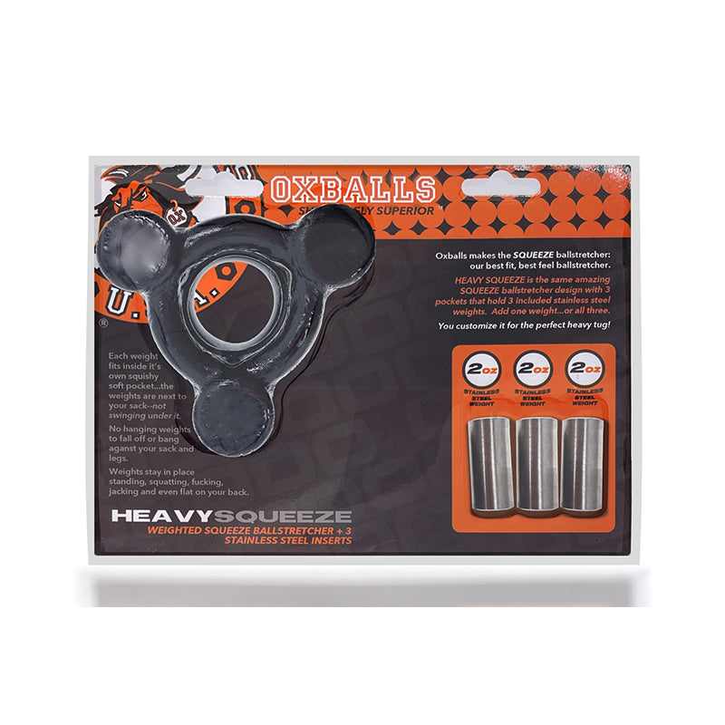 HEAVY SQUEEZE weighted ballstretcher hangs weights on your ballbag, putting three weights directly on your sack in rubbery holders attached to our best original SQUEEZE ballstretcher. HEAVY SQUEEZE comes with 3 stainless-steel weights you can add separately for added weight, less when you want, more when you NEED!