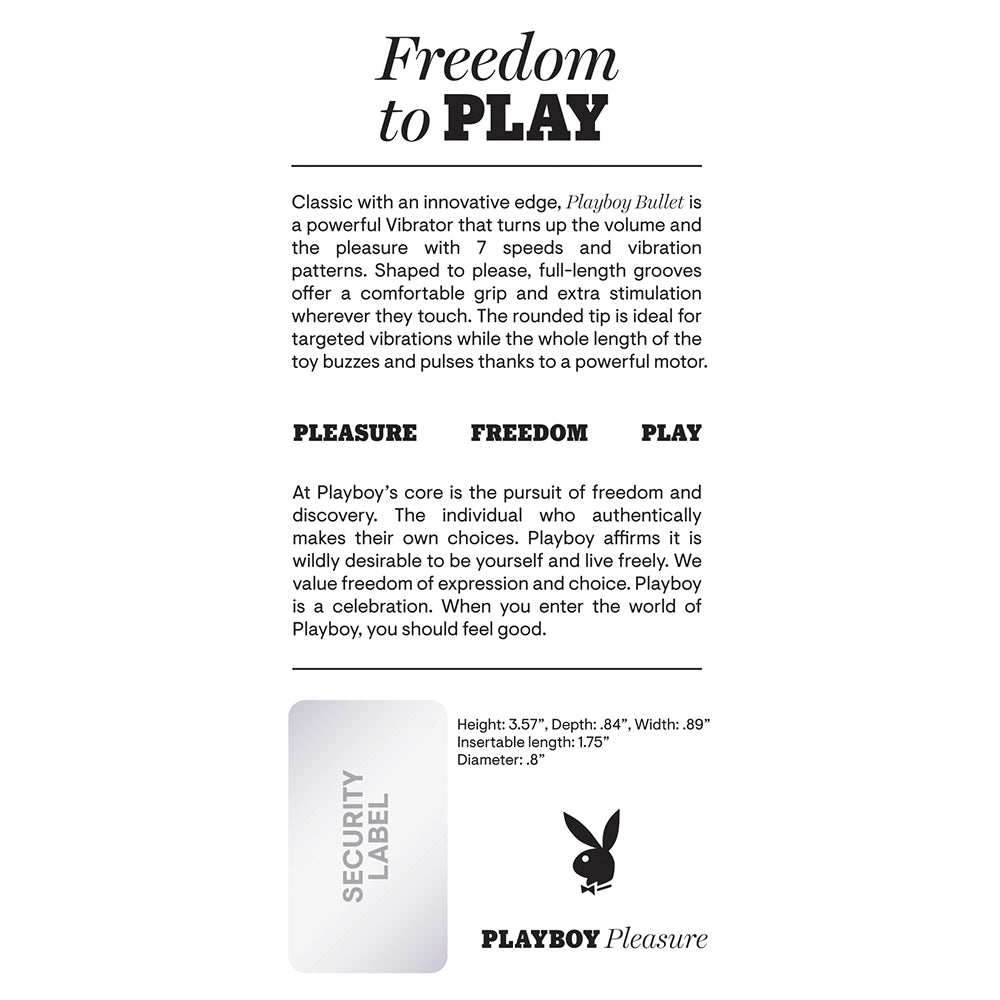 Classic with an innovative edge, Playboy Bullet is a powerful Vibrator that turns up the volume and the pleasure with 7 speeds and vibration patterns. Shaped to please, full-length grooves offer a comfortable grip and extra stimulation wherever they touch. The rounded tip is ideal for targeted vibrations while the whole length of the toy buzzes and pulses thanks to a powerful motor.