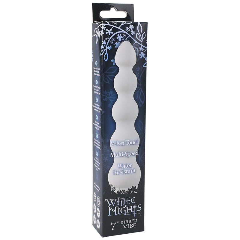 Are you ready for the ultimate in ecstasy? The White Nights Ribbed Vibe provides powerful multi-speed sensations for clitoral stimulation, g-spot pleasure, and anal play. This vibrator is majestically long and rippled, and made of luxurious velvet touch material. The White Nights Ribbed Vibe will serve you anywhere you desire itft.s waterproof, and virtually silent even at full power! Indulge yourself in decadent nights.